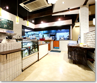 白を基調にしたオープンキッチンのカフェ&創作料理店です。60坪と広い空間に、床は大理石、壁はブロックをあしらい、円形カウンター席とテーブル席を配備、奥にはテラス席が配置されています。